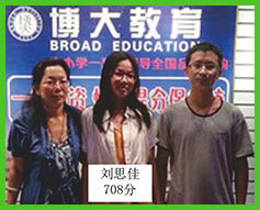 刘思佳该同学入学时为580分,目标为名牌大学。为此,我们针 对该同学自身特点,充分挖掘她的潜力,采取名师把关, 利用“三点提分法”教学,使她的成绩突飞猛进,最终高 考分数达到了708分。成功由普通一本成绩提升至名牌大 学成绩,成为当年理科状元,并考入清华大学。